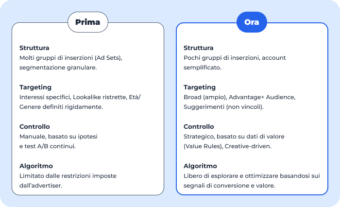 Ora, invece, questi argomenti sono solo suggerimenti: noi advertiser orientiamo l’algoritmo, lo educhiamo, gli diciamo quali sono le nostre preferenze di targeting ma senza regole rigide e limitanti, per cui sarà lui stesso a capire – grazie all’avanzato metodo di profilazione – quali persone sono realmente interessate a questi annunci, in quell’esatto momento.