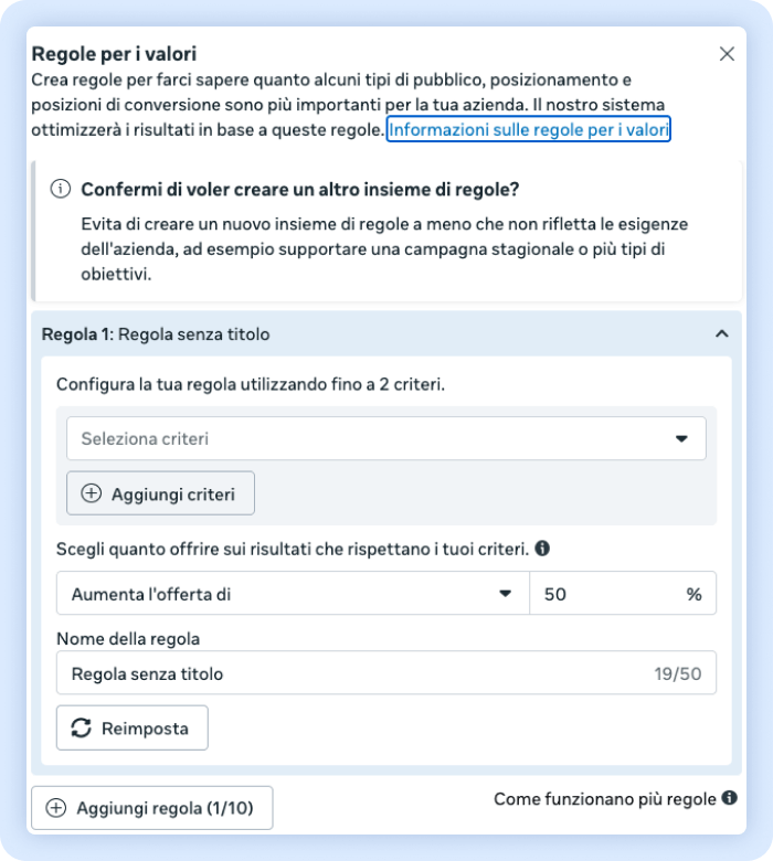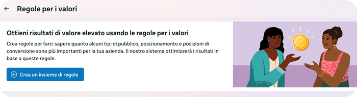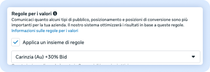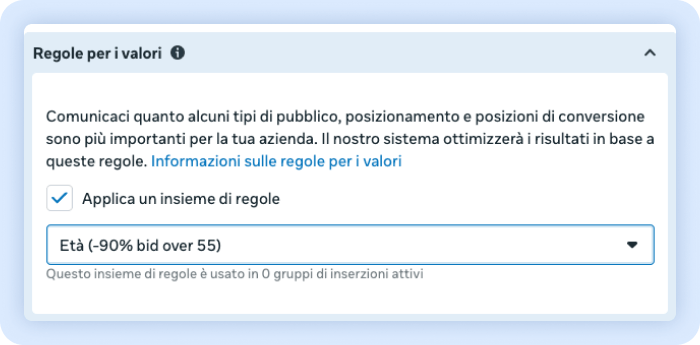 “ti consentono di esprimere il valore tra diversi gruppi di pubblico, posizionamenti e luogo della conversione e raggruppare le campagne per aumentare le prestazioni. Quando usi le regole per i valori, le tue campagne possono regolare la pubblicazione in base ai criteri e ai risultati che ritieni più importanti.”
