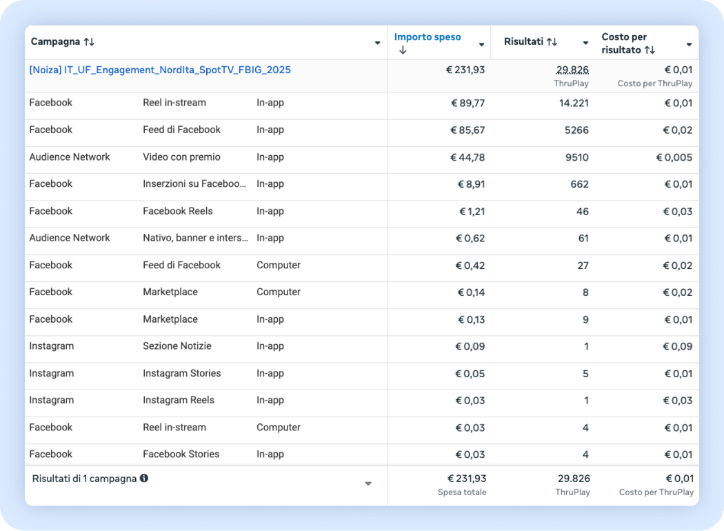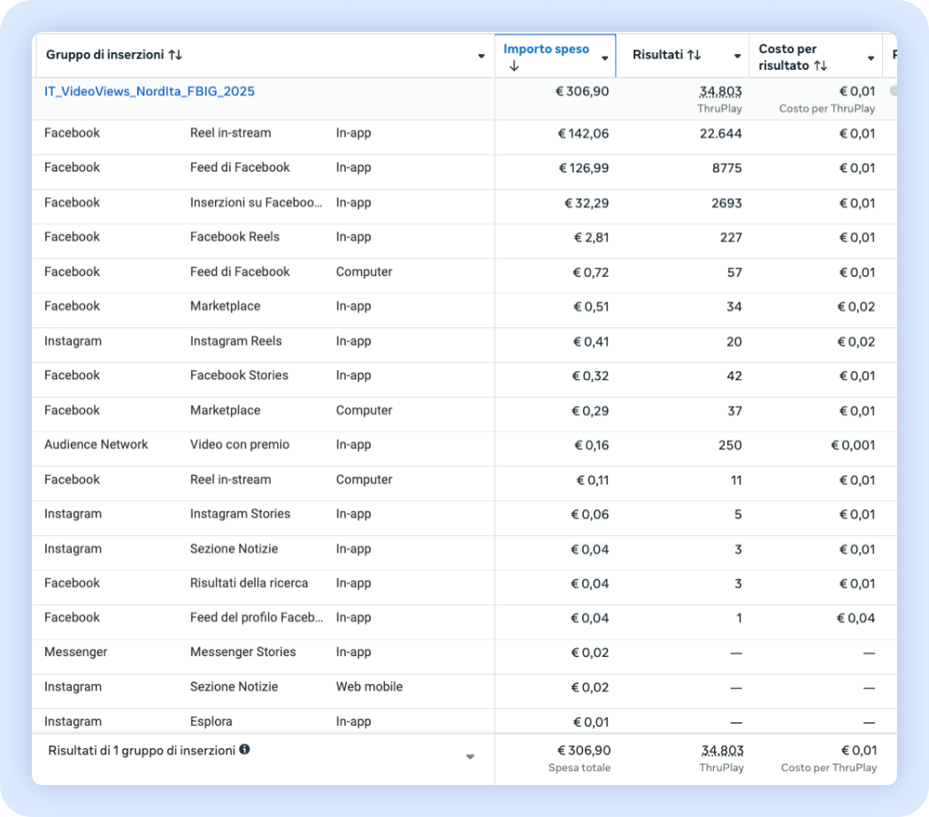 Il 19% della spesa è stata allocata al “Video con premio” di Audience Network, che ha sì un ottimo costo per risultato ma è da ritenere non così performante proprio perché le persone sono forzate alla visualizzazione del video. Pertanto, abbiamo pensato di intervenire subito inserendo una Value Rule che abbassava il bid del 90% sulla piattaforma di Audience Network.