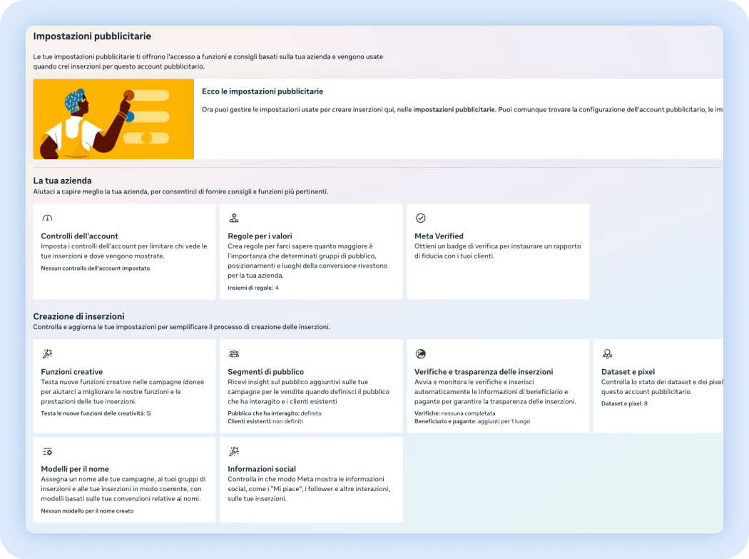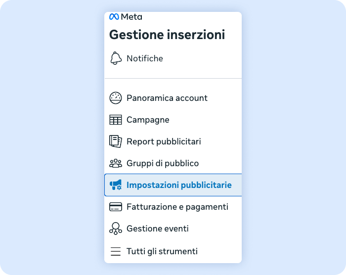 Il procedimento è molto semplice. Accedendo ad Ads Manager, bisogna accedere alla sezione impostazioni pubblicitarie nel menù a sinistra.
